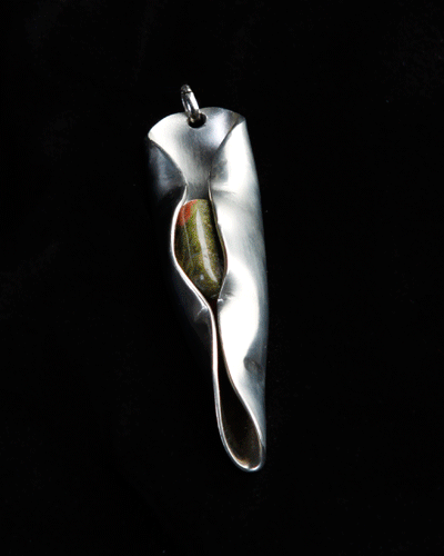 Formas orgánicas de alpaca que abrazan en su interior piedras con propiedades energéticas. La alpaca esta compuesta por una aleación de metales que no produce irritaciones en la piel.